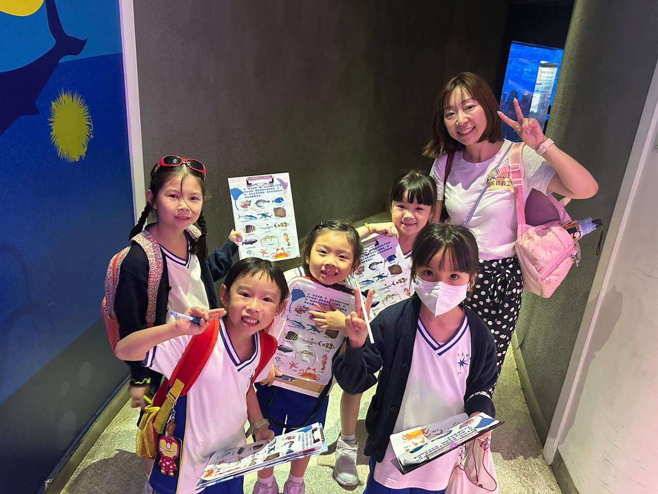 同學拿著學習冊,在水族館內四處觀察,認真尋找各種特徵的魚類,有班紋的、有點點的,邊觀察邊討論,一起完成探索任務!這樣的學習方式,讓知識變得立體又生動。